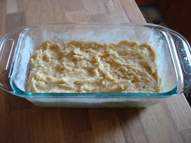 Pre-heat oven to 250 degrees.  Butter and lightly flour bread pan (I suggest using glass pans as the bread cooks more evenly in glass) and set aside.