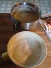 Whip the egg whites in a medium mixing bowl with an electric mixer until they reach medium peaks (soft in the middle). Be careful, you don’t want to overwhip the egg whites.