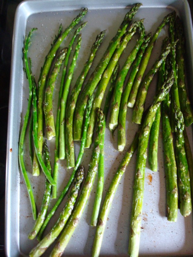 Line asparagus on baking sheet and drizzle with olive oil. Toss to coat and then sprinkle with salt and pepper. Roast for 16 minutes. (Note: cook time depends on width of spears. I had a variety so roasted in batches. The fattest spears needed all 16 minutes while some of the really skinny ones only needed 6.)