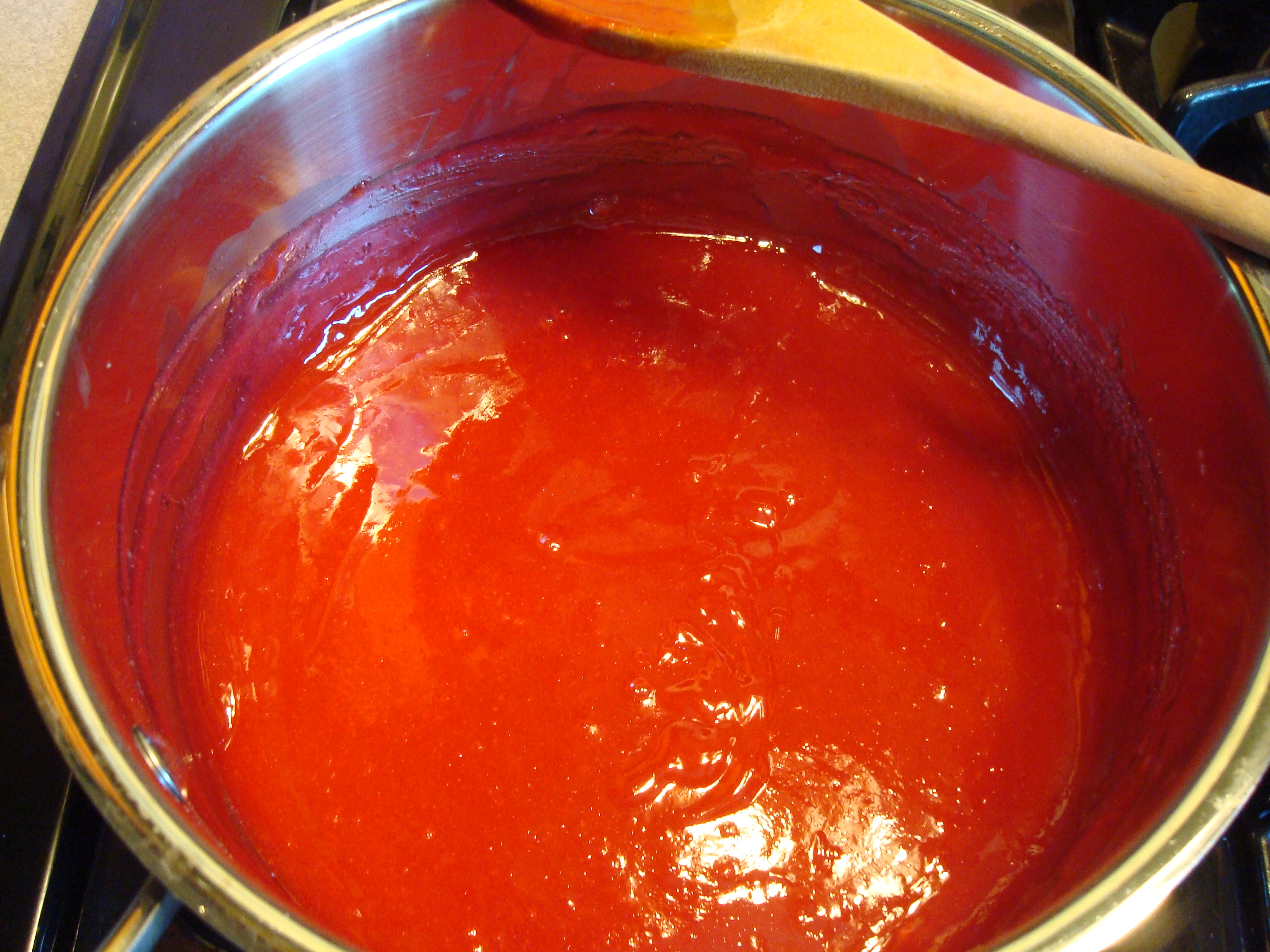 The rest of the pie is done on the stovetop. You boil some sugar, cornstarch, corn syrup and pinch of salt until it’s thick and clear and then remove from heat and add a packet of strawberry Jell-o. (I’m not gonna lie: the almost neon color of the Jell-o sort of freaked me out, but the part of me that felt nostalgic for all the Jell-o I ate in my youth overrode the freaked-out part. You could use clear gelatin to avoid the color additive and I may try that next time.)