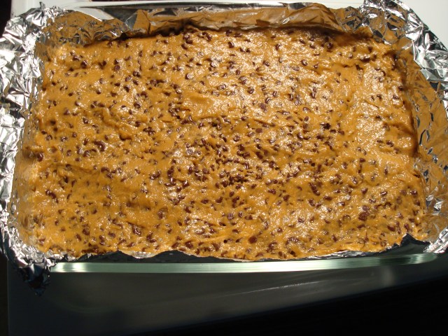 About a month ago when it was approximately 92 degrees at 10 o’clock at night I came home to find a bat flying in circles in my living room.  Bats do not belong in my living room.  I immediately freaked out and shut myself in my bathroom calculating how long I could survive in there if need be.  Fortunately I had my cell phone with me and was able to call for back-up.  My friend volunteered her boyfriend to remove the bat from my apartment and that he did, ever so calmly.  To thank him I bought him a 6-pack of beer and decided to bake him pumpkin chocolate chip square bars.