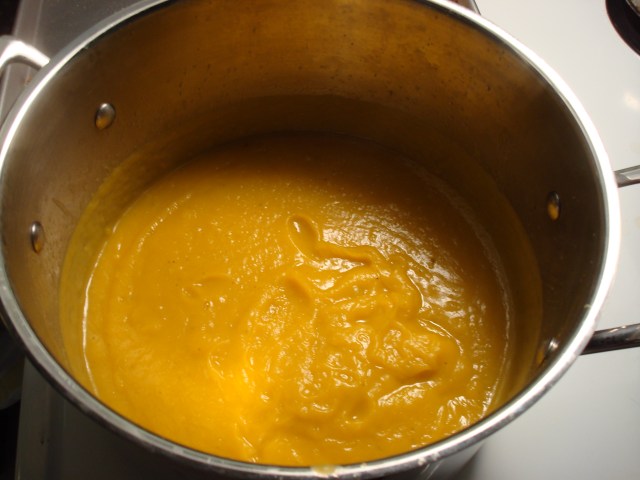 After these ingredients (along with some vegetable or chicken broth) had simmered for a solid half hour I busted out my immersion blender and made a beautiful smooth soup.