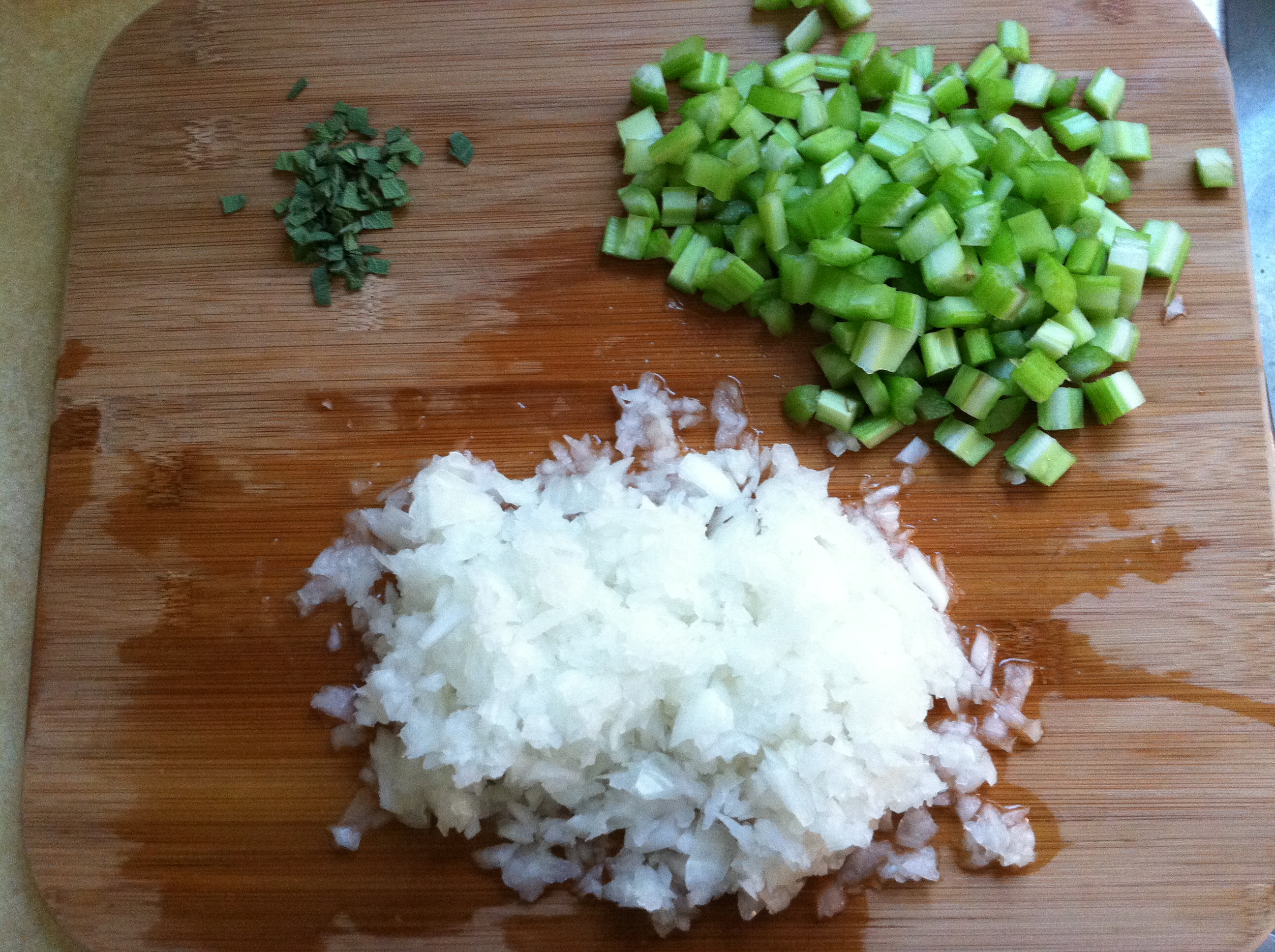 Then you chop up some onions, celery and fresh sage.  Sage is a wonderful herb that does a lot of work this time of year as it pairs very nicely with squash and pumpkin as well as poultry.  Bonus: it makes your house smell wonderful!