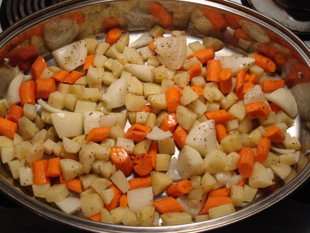 Push vegetables sides of pan, leaving space in center.  Place roast in center of pan.  Cook until meat thermometer inserted into
