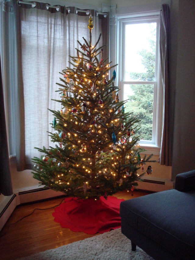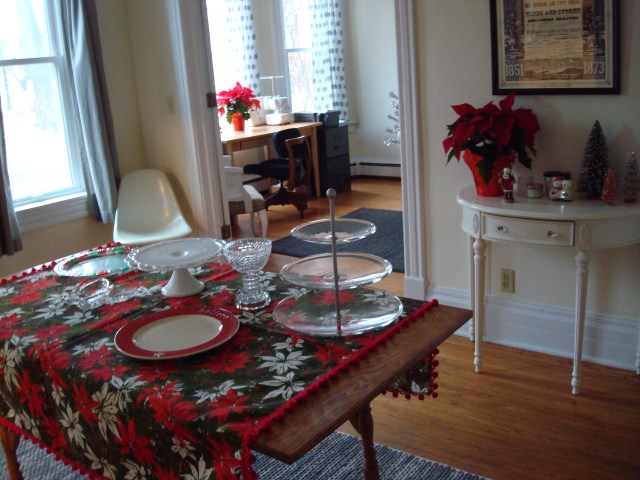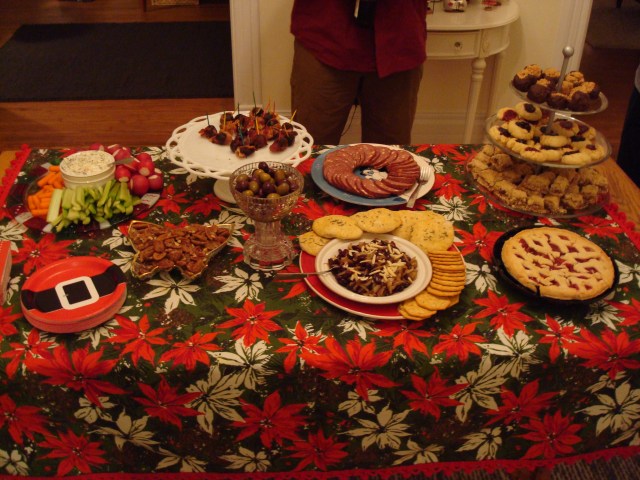I did well to get the holiday table set early in the day before all of the food was done and long before guests arrived.  Granted, I wasn’t able to buy the adorable vintage Christmas tablecloth I had seen at an antique store before Thanksgiving because by the time I went back someone else with (clearly) impeccable taste had already snagged it.  (Note: when you see something you love in an antique/secondhand/thrift store, buy it right away.  Even if you think $30 is a little steep for an adorable vintage Christmas tablecloth with matching napkins, but are later reminded that even at Target or TJMaxx you will be charged $30 for a cheaply-constructed new tablecloth with an inferior design and then kick yourself for being a cheapskate in the first place.)  So I had to settle for my second favorite antique store tablecloth with giant gaudy poinsettias and pom pom fringe.  It worked.  I also planned to make cute little placecards for all of the food and beverages so guests would know what they were partaking in.  Ran out of time.  It happens to the best of us.