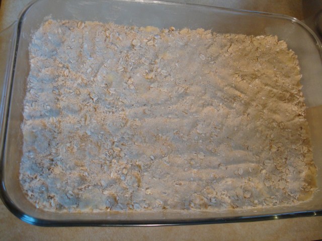 Heat oven to 350 degrees. Grease 13”x 9” pan with butter. In large bowl combine all crust ingredients. (I recommend using a pastry knife or a fork to do so. I used my stand mixer and it pulverized the oatmeal to flour consistency.) Press half of crumb mixture, about 3 cups, into prepared pan. Reserve remaining crumb mixture for topping. Bake for 10 minutes.