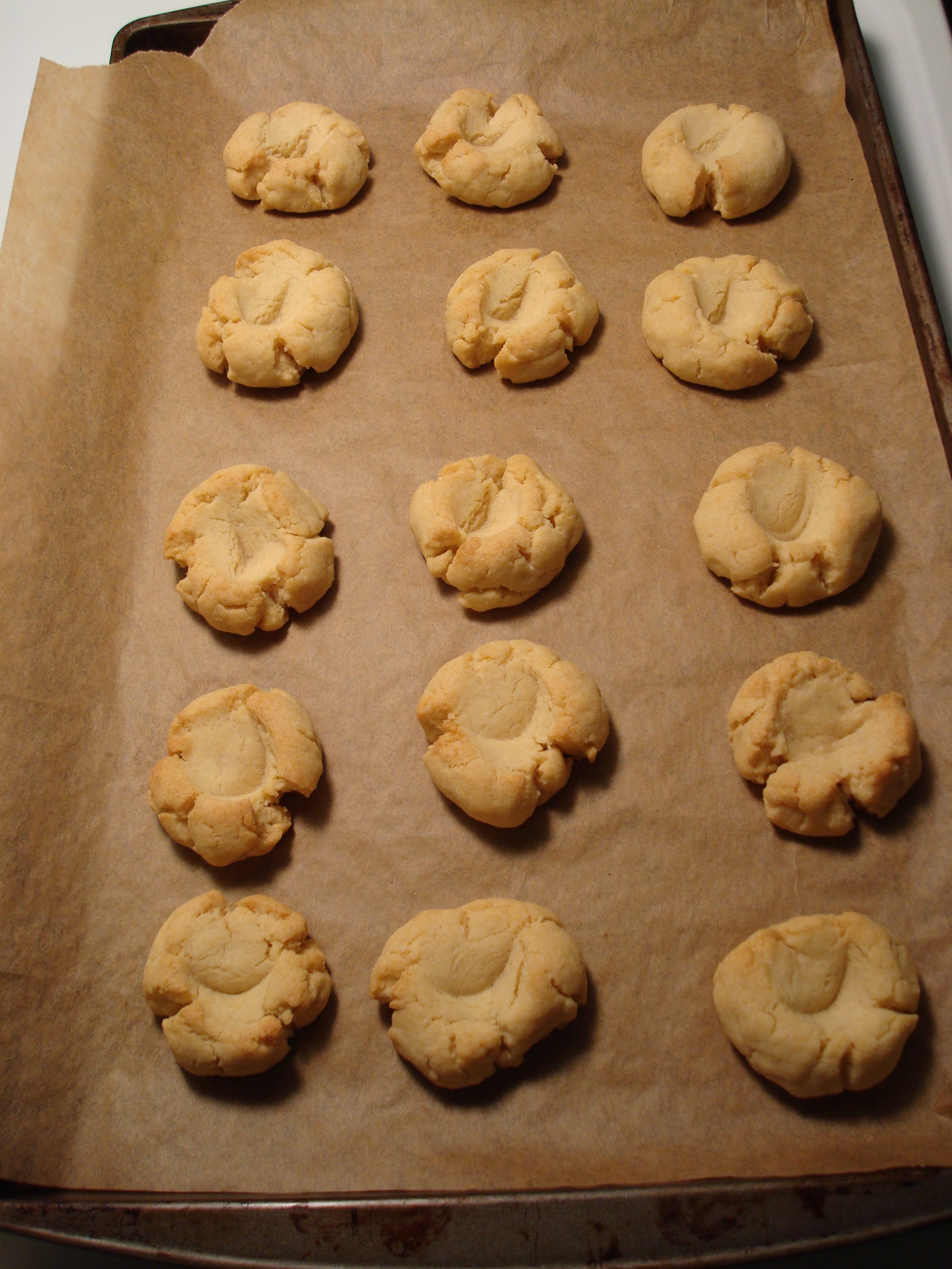 Press well into the center of each ball using your finger. Refrigerate until firm, about 30 minutes. Bake at 350 for 7 minutes. Remove from oven, and press well again with handle end of a wooden spoon. Bake until firm, 7 to 9 minutes more.