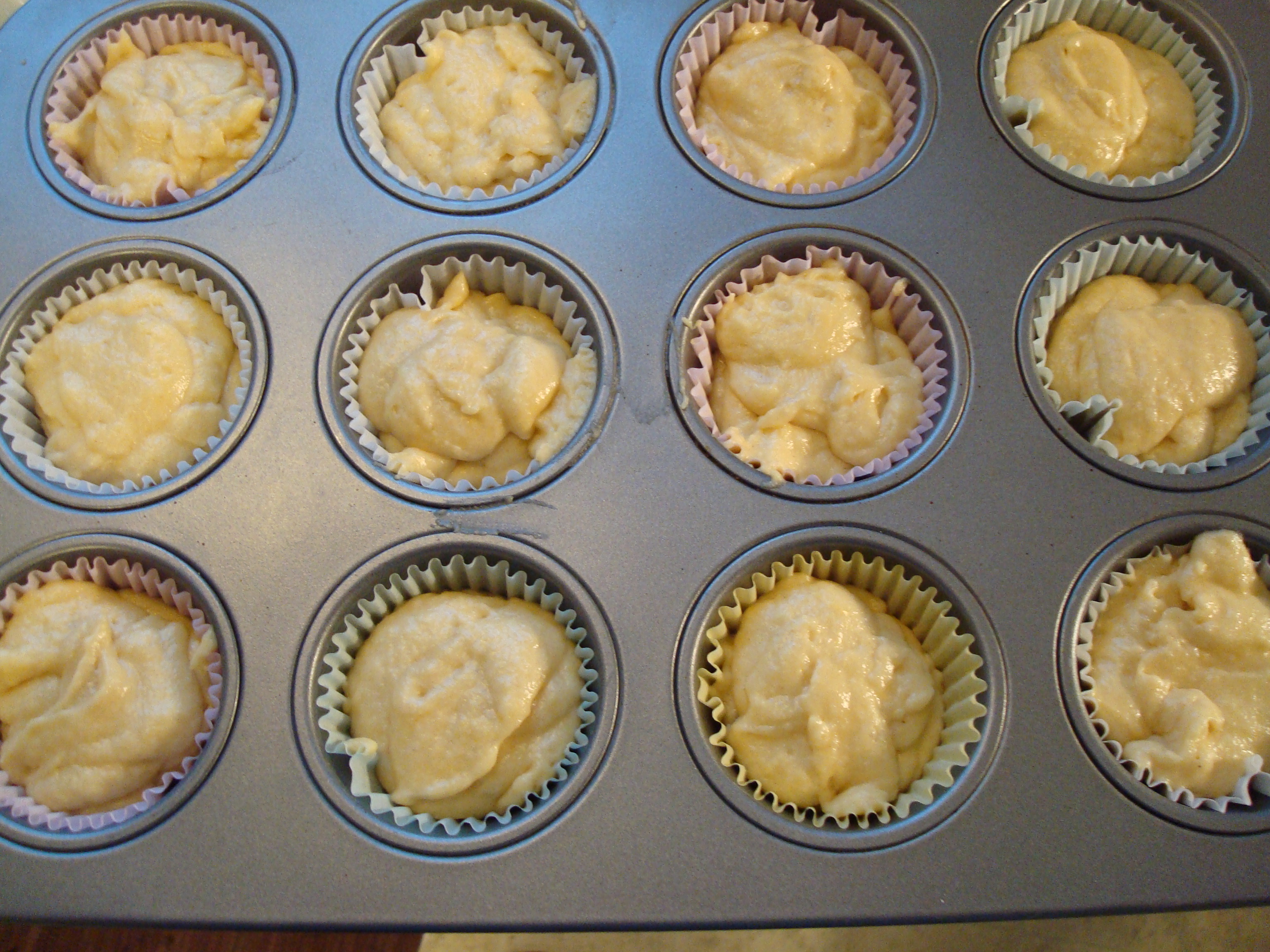 Pour 1/3 cup batter into each prepared cup, almost filling it. Bake the cupcakes on the center rack for 22 minutes, rotating the tins 180 degrees after 15 minutes. The finished cupcakes will be golden brown and will bounce back when pressure is applied gently to the center.