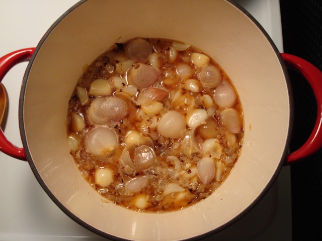 Heat 1 ½ tablespoons oil in a Dutch oven over medium heat; add onion. Cover and cook 15 minutes or until lightly browned, stirring occasionally. Add garlic pulp, peeled shallots, and wine. Reduce heat; simmer, uncovered, 5 minutes.