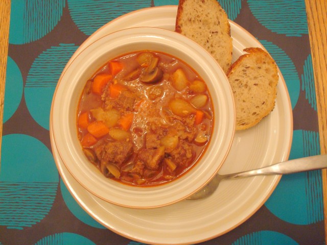 My grandma used to make a really good beef stew when I was growing up and this recipe reminded me a lot of hers.  I’m pretty sure my grandma didn’t drop a garlic/ginger skewer into her stew, but it really did add nice flavor to it, so much so that I am thinking I might start dropping garlic/ginger skewers into all soups and stews going forward!