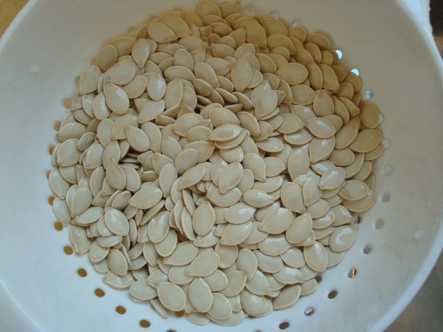 Now, the seeds! Rinse those beautiful things off to get as much stringy pumpkin removed as possible. Then spread out on a baking sheet to dry for several hours or overnight. (Word to the wise: do not attempt drying with paper towels as I did last year. Pumpkin seeds are very sticky and slimy and will stick to the paper towel like superglue. Not cool.)