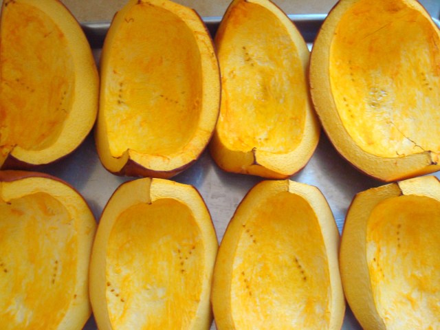 First you cut off the top of the pumpkin, and then slice it in half down the center. Next you scoop out the seeds (don’t throw them away though! We’re going to need them in a minute.) Then you cut the pumpkin halves in half and place on a baking sheet. Bake in the oven for about 45 minutes (mine were kind of large so it took closer to an hour). Then walk away and go catch up on your magazine reading or DVR shows while it bakes.