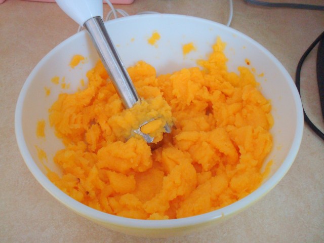 Dump the pureed goodness into a bowl, and continue pureeing until all the pumpkin is done.