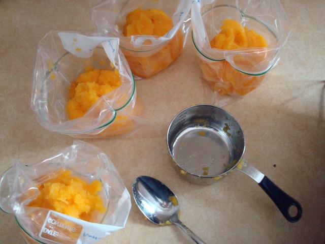 To store in the freezer, spoon about 1 cupful of pumpkin into each plastic storage bag. Seal the bag with just a tiny bit of an opening remaining, then use your hands to flatten out the pumpkin inside the bag and push out the air. Store them in the freezer until you need them.