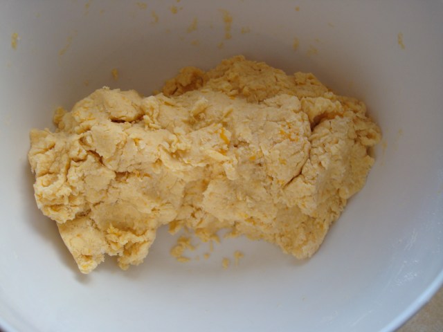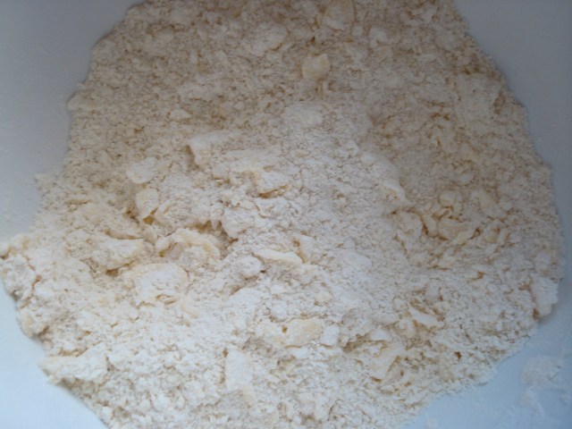 You start out by using your fingers to rub together cold chunks of butter with some flour, sugar, baking powder, salt and (in this case) parmesan cheese and nutmeg until the mixture looks like coarse crumbs.