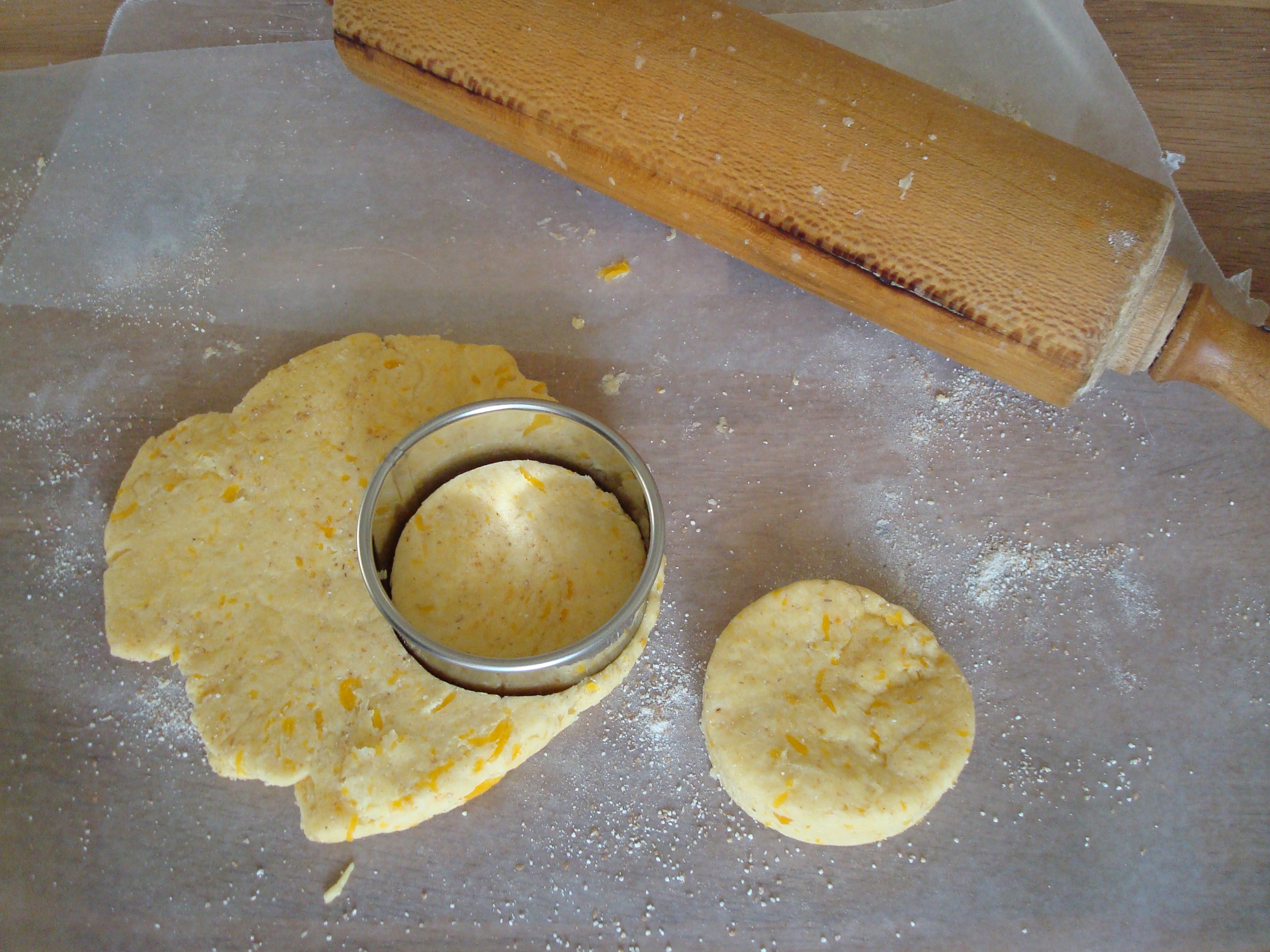 Next you roll the dough out on a piece of lightly floured wax paper and use biscuit cutters (a round upside-down drinking glass also works in a pinch) to cut the dough.
