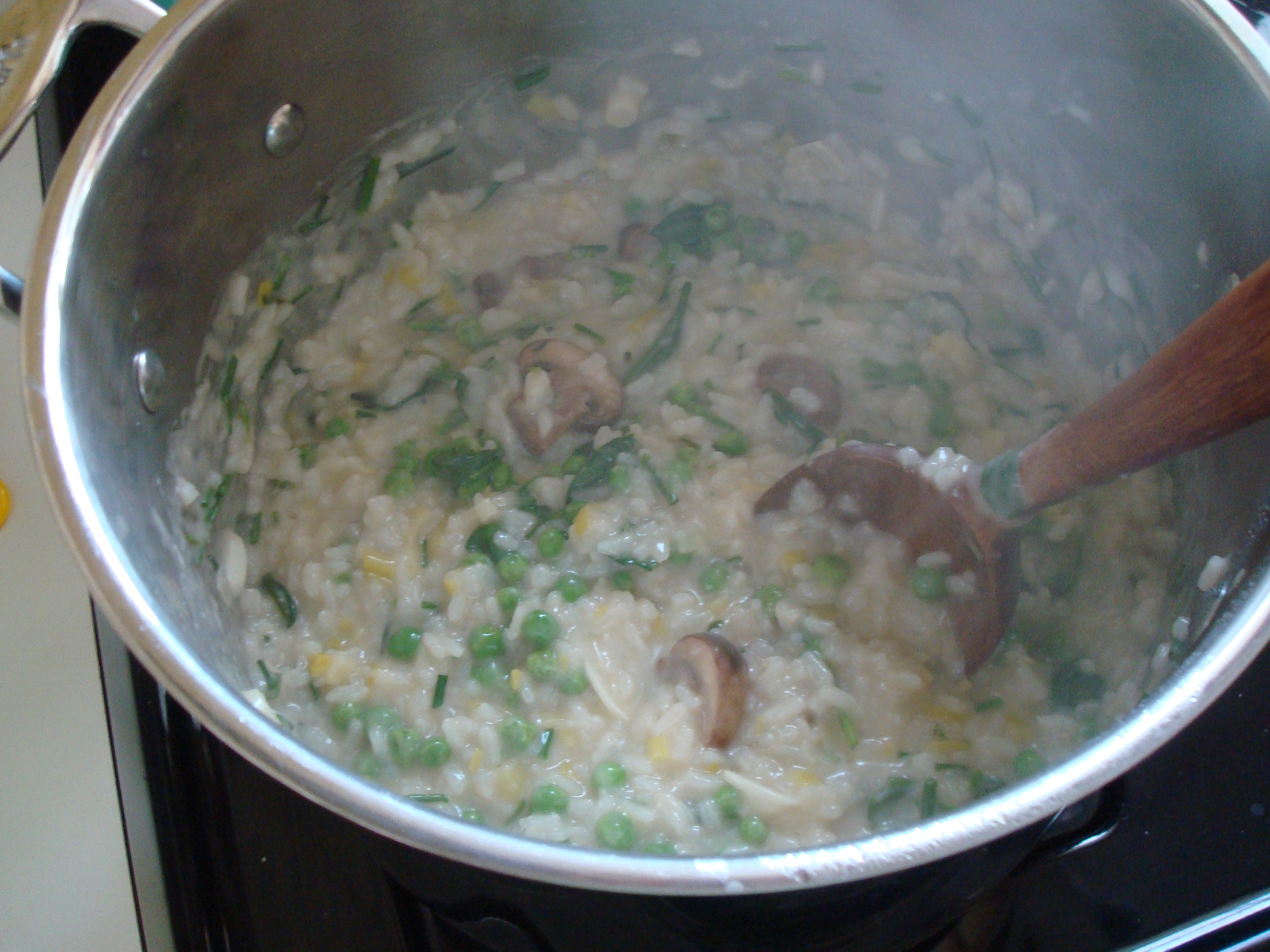 This is such a gret time of year– things are blooming and turning green outdoors and after a winter of nothing but root vegetables at the farmer’s market you start to see fresh green things.   This risotto uses some of those fresh farmer’s market ingredients and truly tastes like spring.