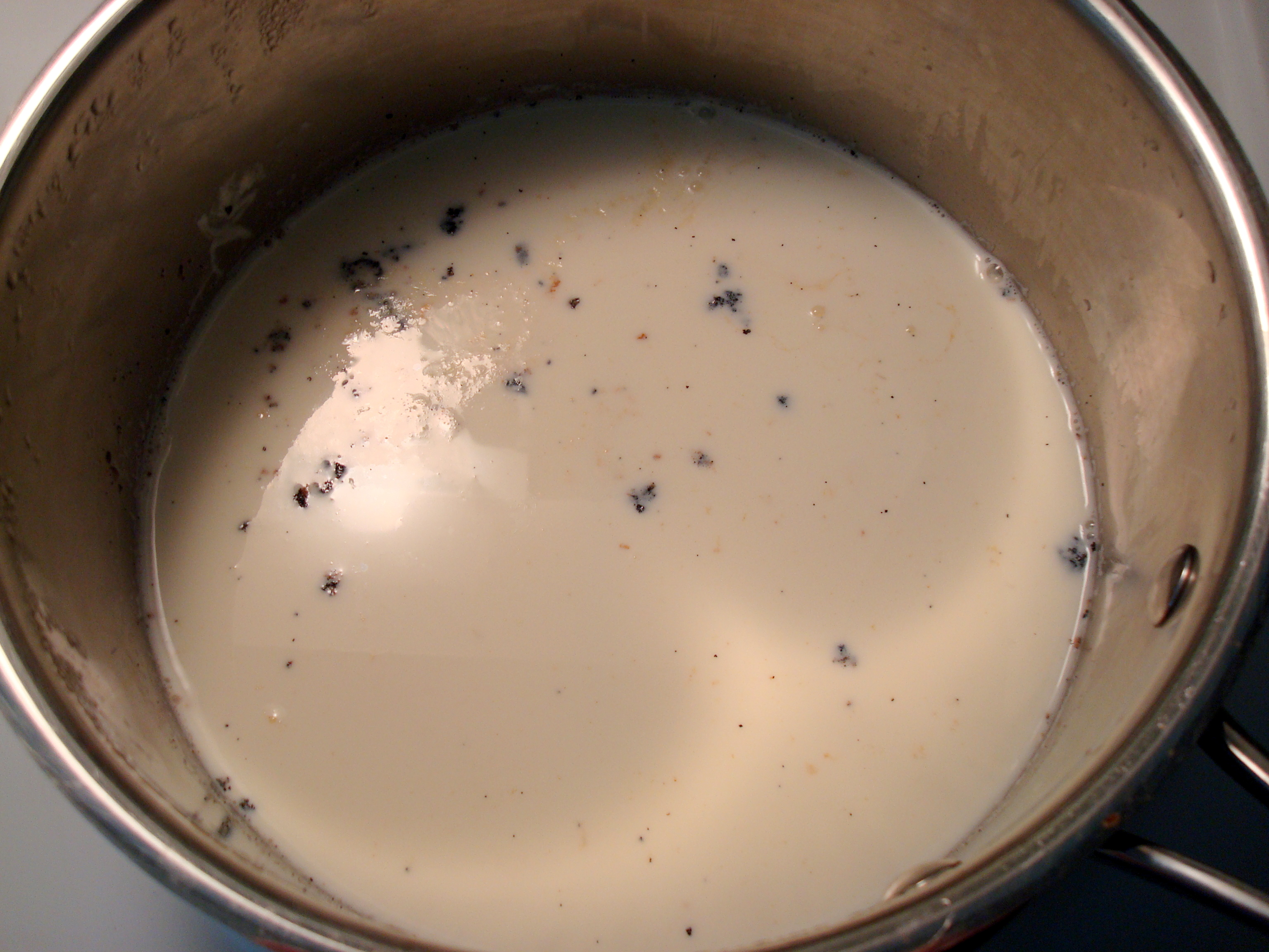 In a medium saucepan, heat milk and vanilla bean and scrapings. Bring to a gentle boil, cover, and remove from heat. Steep for 30 minutes.