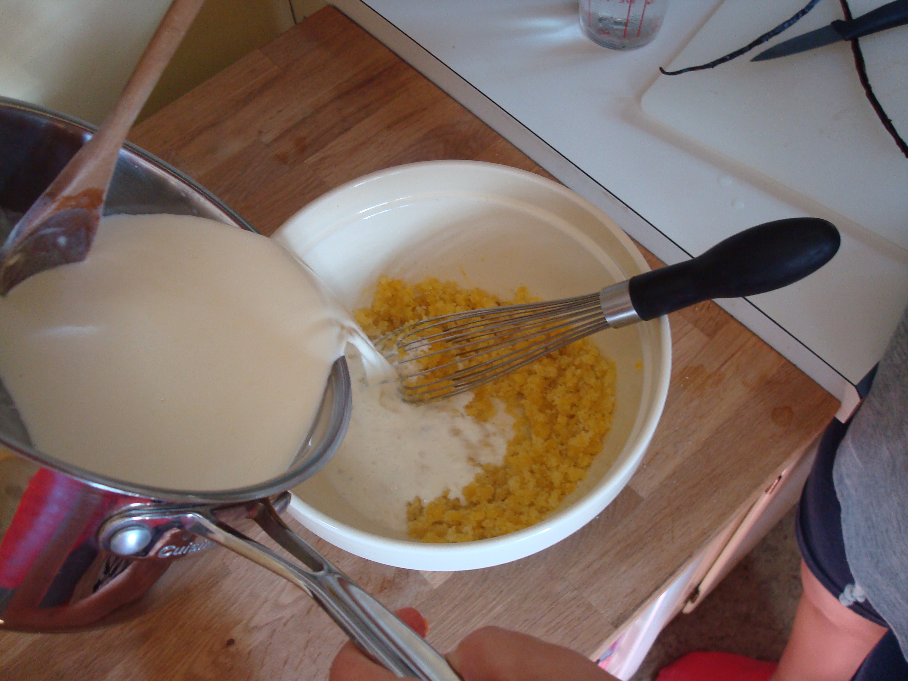 Then I stirred egg yolks into the vanilla-infused sugar while heating up whole milk and heavy cream over the stove to the point of steaming but not boiling.