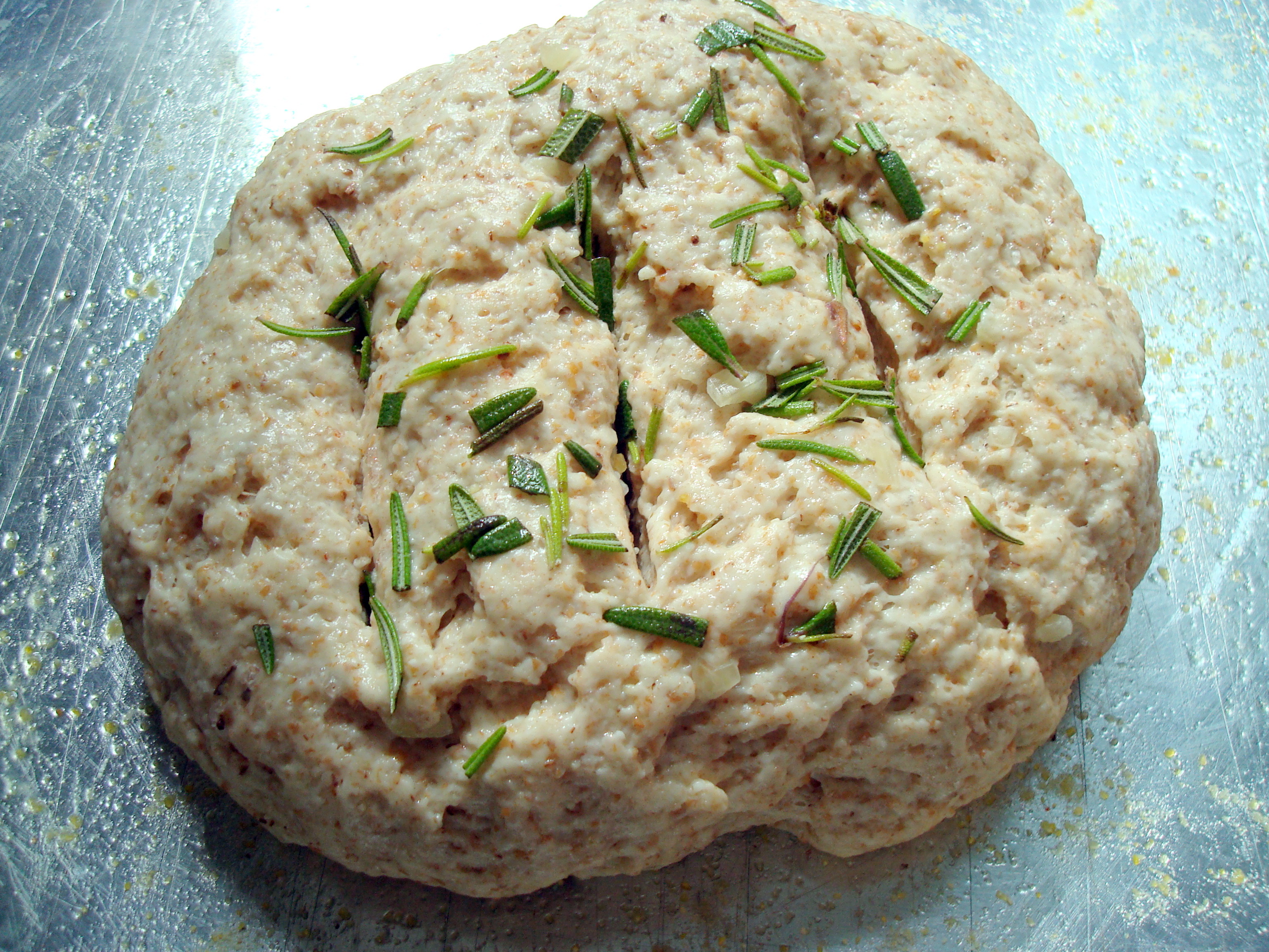 Stir in the oil, sat, lemon juice, garlic and rosemary.  Stir in the flours; then knead for 10 minutes.