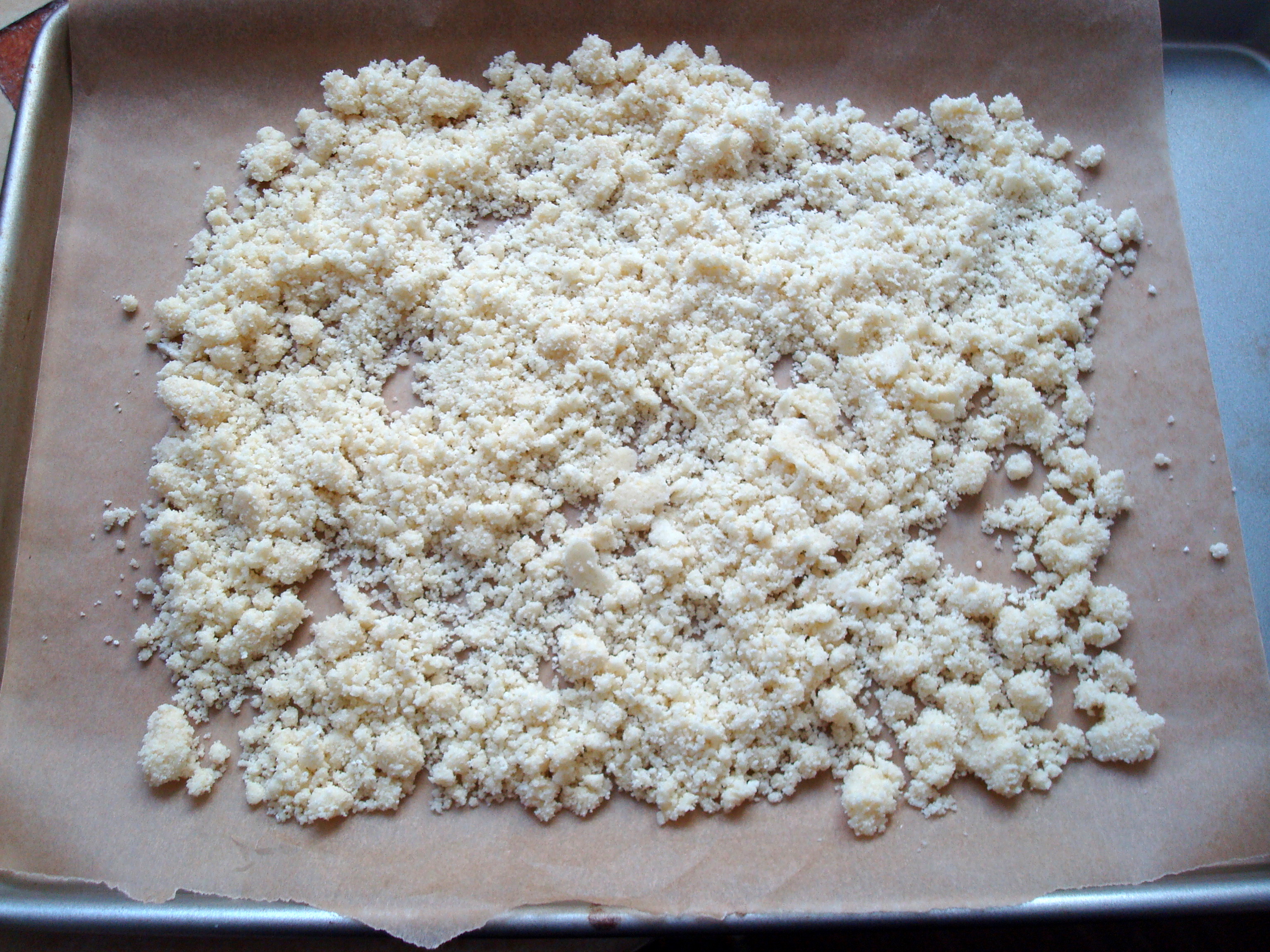 Spread the clusters on a parchment- or Silpat- lined sheet pan and bake for 20 minutes.  Cool the crumbs completely.