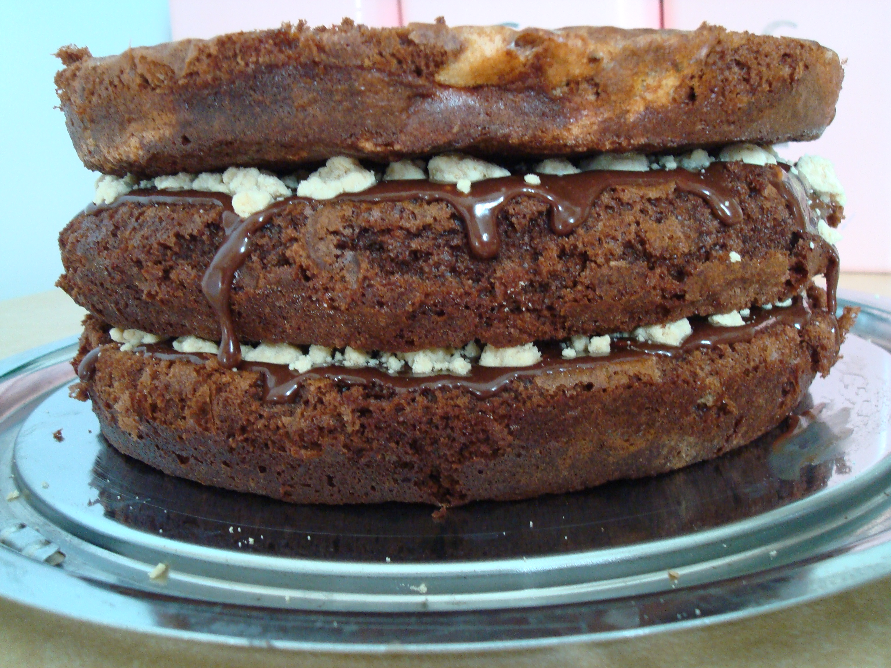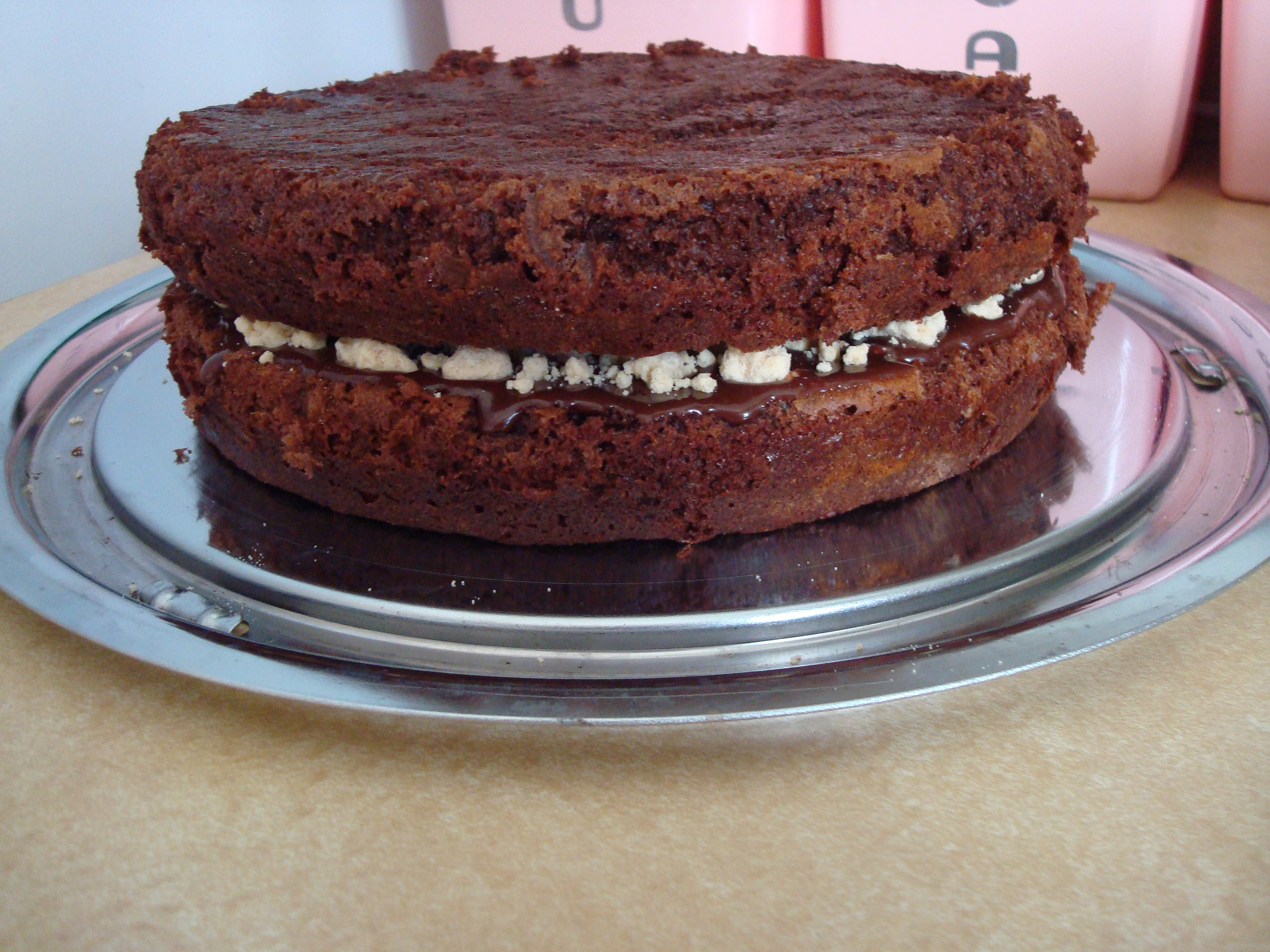 Place one cake round on plate.  Re-heat the Malt Fudge Sauce if necessary by microwaving at 30-second intervals in the microwave until at spreadable consistency.  Spread approximately half of the Malt Fudge Sauce over the cake and smooth with a spatula.  Sprinkle about ½ cup of the Malt Crunch over the fudge.  Place second cake round on top and repeat with Malt Fudge Sauce layer and Malt Crunch.  Place third cake round on top.  Frost top and sides of cake with Cocoa Mascarpone Frosting.