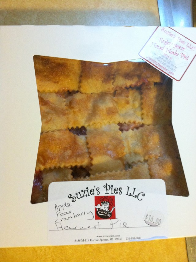 I also managed to sneak in a quick trip to Suzie’s Pies in Harbor Springs (which is located at the other end of the strip mall from Polish Kitchen though had not realized that when I was there a month earlier) to purchase a “Harvest” pie with apples, pears, and cranberries. Suzie herself helped me and she could not be sweeter and the pie was awesome. I also sampled a piece of her Canadian Butter Tart which was equally as delicious.